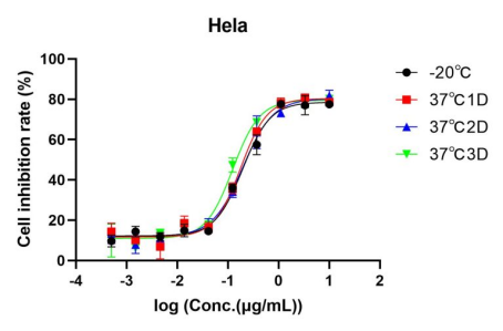 Figure 3. Accelerated stability test of AME100003. Following lyophilization, samples were stored at -20°C (black), 37°C for 1 day (red), 37°C for 2 days (blue), and 37°C for 3 days (green), separately. Upon reconstitution, the cell inhibition rate of each sample was determined using the CCK8 method. The data indicate excellent stability for all samples.