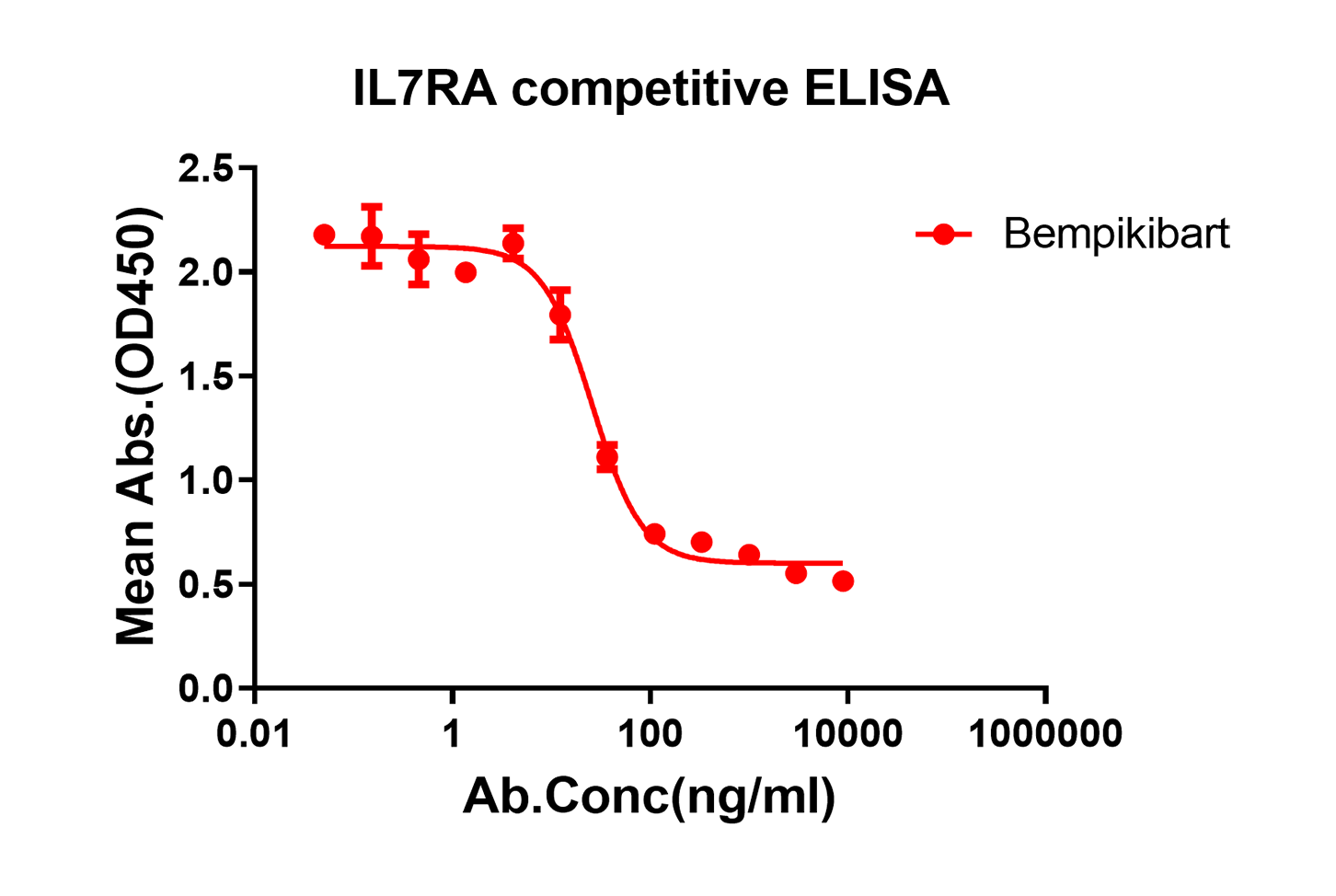 Competitive ELISA showing inhibition of IL-7RA–ligand binding by a Bempikibart biosimilar. Serial antibody dilutions were incubated with IL-7RA-hFc, followed by biotinylated lL7-hFc detection. The blocking curve yields an IC?? of 25.96 ng/mL.