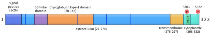 TROP2是一種癌相關(guān)抗原,是分子大小為36 kDa的單次跨膜的表面糖蛋白。TROP2蛋白由四部分組成,包含323個(gè)氨基酸,其中1-26aa為疏水性先導(dǎo)肽,27-274aa為胞外結(jié)構(gòu)域,275-297aa為跨膜結(jié)構(gòu)域,剩下的298-323aa為胞質(zhì)尾區(qū)。此外,TROP2蛋白的4個(gè)潛在潛在N-連接糖基化位點(diǎn)集中在胞外結(jié)構(gòu)域,分別位于33、120、168和208號(hào)氨基酸上。TROP2胞質(zhì)尾區(qū)具有保守的結(jié)構(gòu)基序,這些結(jié)構(gòu)基序?qū)ROP2依賴性信號(hào)傳導(dǎo)至關(guān)重要。此外,TROP2胞質(zhì)尾區(qū)還包含一個(gè)保守的酪氨酸和絲氨酸磷酸化位點(diǎn),其中303位絲氨酸殘基突變可以使TROP2失去刺激腫瘤生長(zhǎng)的能力。