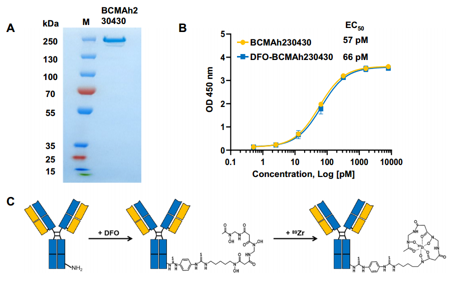 Figure 1. A: BCMAh230430抗體SDS-PAGE驗(yàn)證; B: ELISA檢測(cè)BCMAh230430和DFO-BCMAh230430抗體親和力; C: BCMAh230430抗體DFO結(jié)合形式和89Zr的標(biāo)記形式