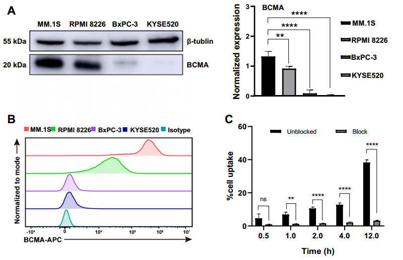 Figure 2. A: Western blot(WB)體外分析BCMA表達(dá)及BCMAh230430抗體與腫瘤細(xì)胞結(jié)合能力; B: 流式細(xì)胞術(shù)檢測(cè)BCMA在四種細(xì)胞株中的差異表達(dá); C: MM.1S細(xì)胞株對(duì)[89Zr]Zr-DFOBCMAh230430的攝取及在100倍過量的冷DFO-BCMAh230430存在下的阻斷研究(n=3)