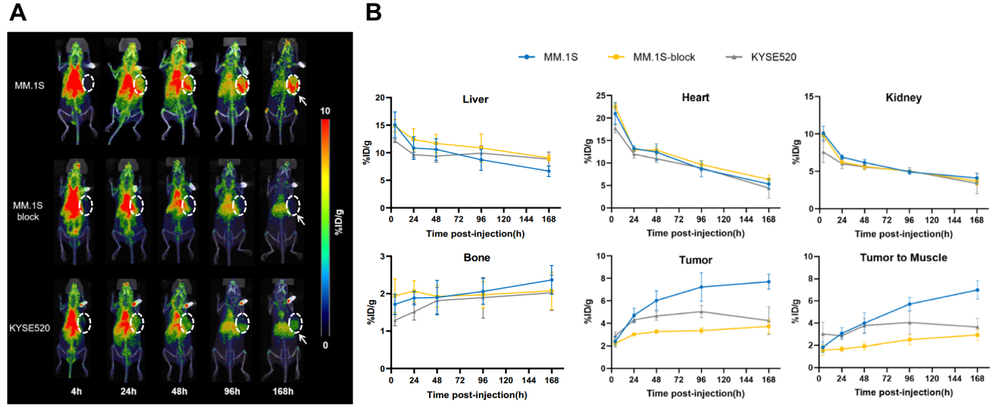 在完成細(xì)胞系的篩選及體外實(shí)驗(yàn)驗(yàn)證之后,作者團(tuán)隊(duì)構(gòu)建了MM.1S和 KYSE520 荷瘤模型,將細(xì)胞通過皮下注射到雌性 BALB/c 裸鼠(4 周齡)的側(cè)腹中建立腫瘤模型。而后采用PET顯像監(jiān)測(cè)了荷瘤模型在注射[89Zr]Zr-DFOBCMAh230430 后4至168小時(shí)內(nèi)不同時(shí)間點(diǎn)的成像,結(jié)果顯示注射 [89Zr]Zr-DFOBCMAh230430 后,腫瘤攝取顯著降低(Figure 3. A)。MM.1S 腫瘤在晚期時(shí)間點(diǎn)的腫瘤攝取量幾乎是 KYSE520 腫瘤的兩倍,且腫瘤與肌肉的比例具有相似的趨勢(shì)(Figure 3. B)。