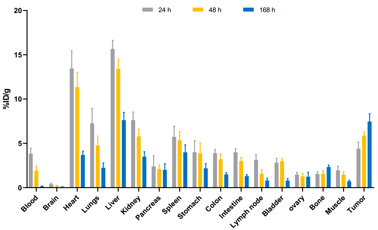 Figure 4. 施用放射性示蹤劑后24小時(shí)、48小時(shí)和168小時(shí),[89Zr] Zr-DFO-BCMAh230430 在人類 MM.1S皮下異種移植物(n=4)中的生物分布。