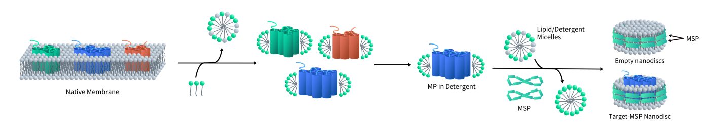 MSP nanodisc使用Membrane scaffold proteins(MSPs)作為穩(wěn)定劑,包裹人工磷脂成分和跨膜蛋白,形成一個(gè)納米圓盤。所形成的納米圓盤的大小由所選用的MSPs決定,一般直徑范圍為7至13nm。Nanodisc組裝中常用的MSP,包括MSP1D1、MSP1D1-DH5和MSP1E3D1。 這些MSP已被廣泛研究并證明可有效生成穩(wěn)定且功能性的Nanodisc蛋白。