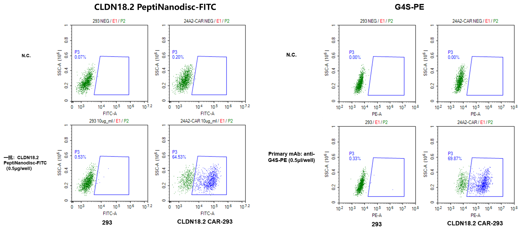 FITC標(biāo)記CLDN18.2 peptiNanodisc(Cat.No.FLP420014)和G4S-PE蛋白來檢測CLDN18.2 CAR細(xì)胞陽性率