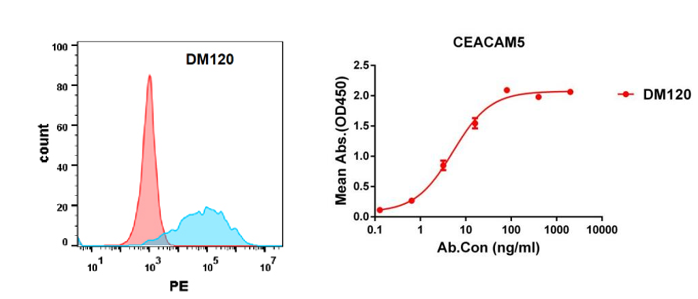 Figure 4. Validation data of Anti-CEACAM5 antibody(DM120) Rabbit mAb (DME100120). Flow cytometry analysis with Anti-CEACAM5 (DM120) on HEK293 cells transfected with human CEACAM5(Blue) or irrelevant protein (Red) (left). Anti-CEACAM5 antibody(DM120) (DME100120) can bind His tagged protein (PME100071) in a linear range of 0.1-50 ng/ml (right).