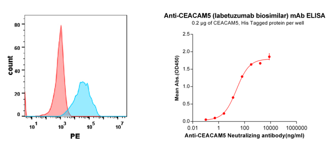 Figure 5. Validation data of Anti-CEACAM5 (labetuzumab biosimilar) mAb (BME100035); Flow cytometry analysis with Anti-CEACAM5 (labetuzumab) on HEK293 cells transfected with human CEACAM5 (Blue) or HEK293 transfected with irrelevant protein(Red) (left). His tagged protein (PME100071) can bind Anti-CEACAM5 Neutralizing antibody(BME100035) in a linear range of 2.56-320 ng/ml (right).
