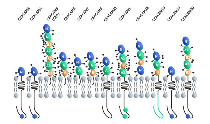 CEACAMs分子屬于免疫球蛋白超家族黏附分子,是一類細胞表面糖蛋白家族,共包含12個家族成員,分別是CEACAM1、CEACAM3、CEACAM4、CEACAM5、CEACAM6、CEACAM7、CEACAM8、CEACAM16、CEACAM18、CEACAM19、CEACAM20和CEACAM21。除CEACAM16外,其他CEACAMs蛋白分子N端都有一個108個氨基酸組成的免疫球蛋白可變區(qū)(IgV)樣結(jié)構(gòu)域,而CEACAM16蛋白N端有兩個。不過,它們N端的免疫球蛋白恒定區(qū)(IgC)2型樣結(jié)構(gòu)域數(shù)量從0-6個不等。雖然所有CEACAMs分子都連接在細胞膜上,但不同的是,CEACAM5、CEACAM6、CEACAM7和CEACAM8是通過GPI連鎖與細胞膜結(jié)合,而CEACAM1、CEACAM3、CEACAM4、CEACAM19、CEACAM20和CEACAM21是通過跨膜結(jié)構(gòu)域錨定在細胞膜上。CEACAM16是無膜錨定的分泌型。