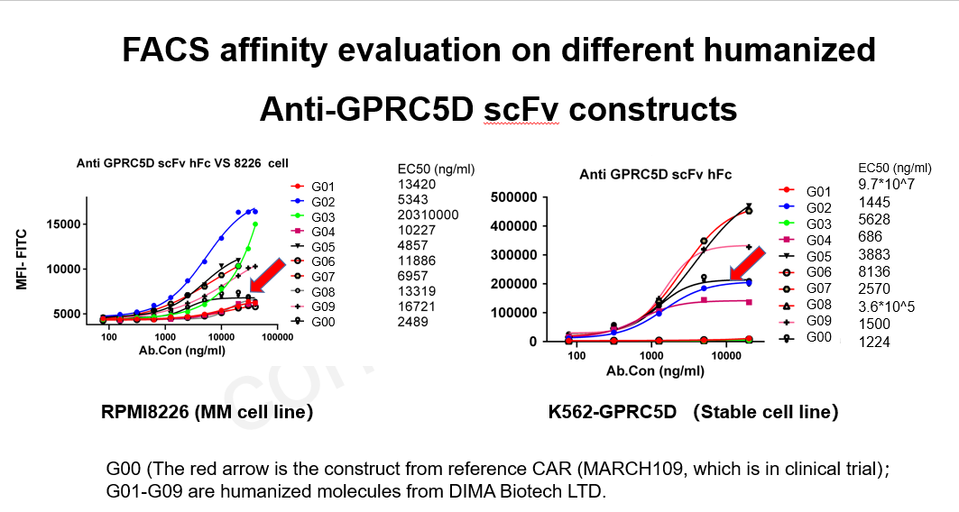 Figure 2. Affinity ranking of 9 humanized anti-GPRC5D DIMA’s mAbs through flow assay. Comparing to BMK antibody (G00) pointed by red arrow, derived from a CAR construct currently in phase I clinical trial, 4 out of 9 DIMA’s mAbs exhibit stronger binding affinity on both RPMI8226 or K562-GPRC5D stable cell line.