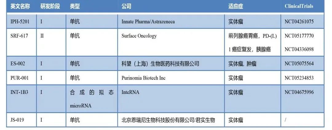 除了TTX-030,目前靶向CD39的一些藥物列表: