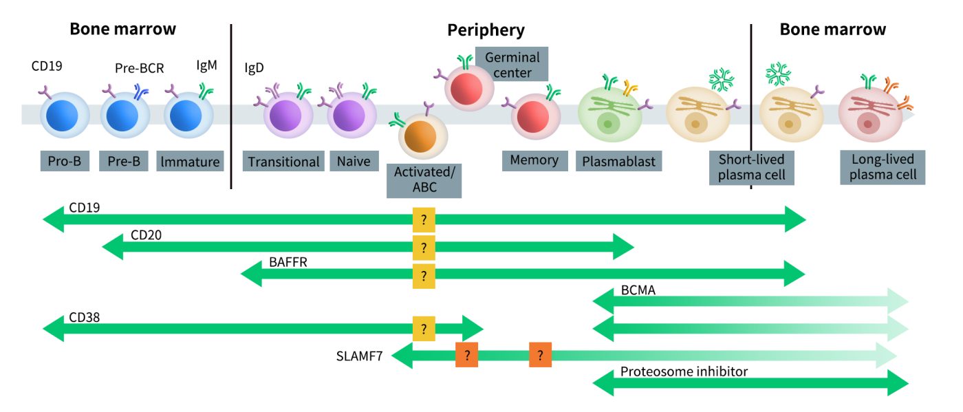 此外,Inebilizumab(anti-CD19) 也作為替代靶點正在研究,其能覆蓋更廣泛的B細胞亞群(包括漿母細胞),對SLE等B細胞主導(dǎo)性疾病可能具有額外優(yōu)勢。