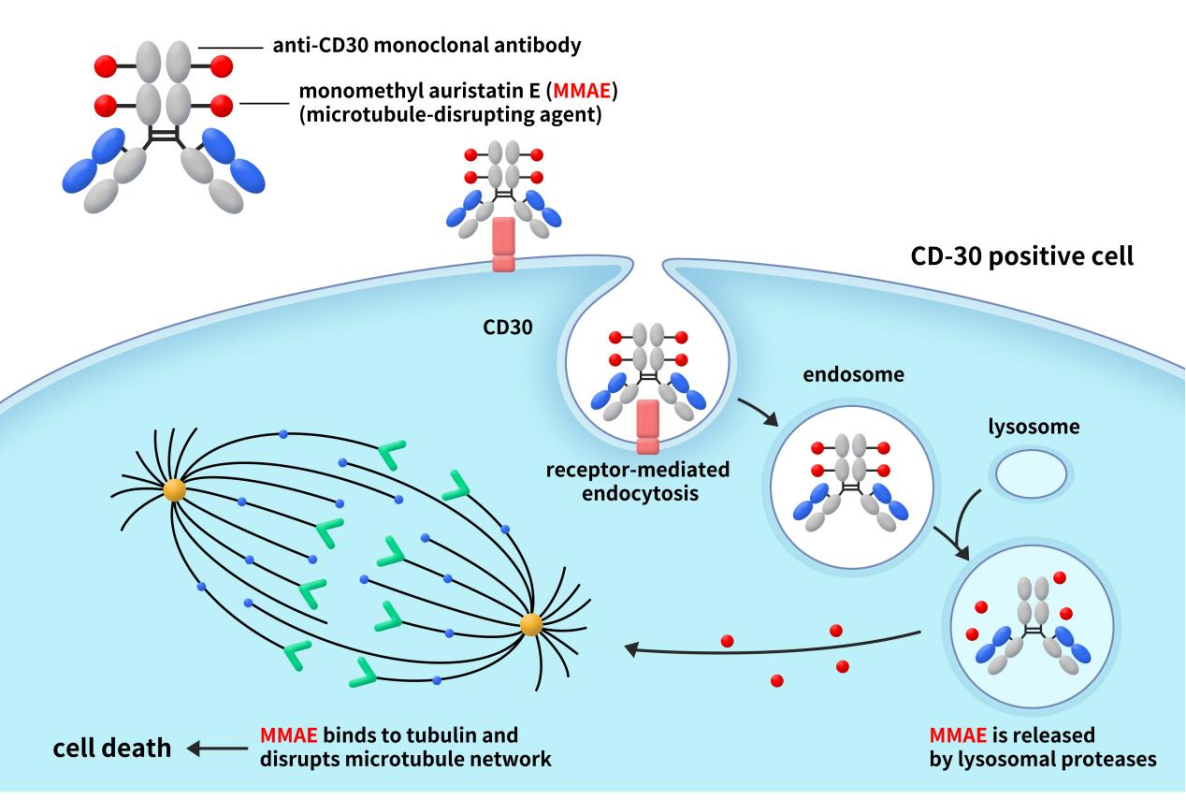 如前所述,MMAE作為熱門小分子藥物廣泛用于抗體藥物偶聯(lián)物 (ADC) 開發(fā),用于治療多種不同的癌癥類型,是目前使用最廣泛的有效負載。例如,Adcetris、Polivy、padcev 和 vidicizumab 都使用了MMAE。本文中以Adcetris為例對MMAE的作用機理進行闡述。