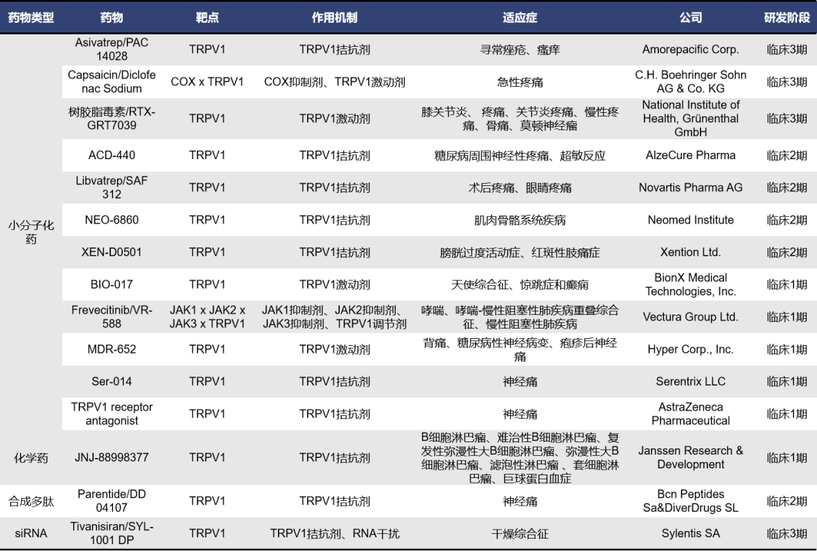 不完全統(tǒng)計,目前全球靶向TRPV1藥物共計106款。其中,處于臨床前階段的有31款,已終止及無進展的共計49款,獲批上市的有3款,處于臨床階段的有15款。涉及多種藥物類型,包括小分子化藥、合成多肽、siRNA等,其中以小分子化藥數(shù)量占主導,有近89款。而且,目前已上市的三款均為小分子化藥。這里重點匯總了處于臨床階段的靶向TRPV1藥物。