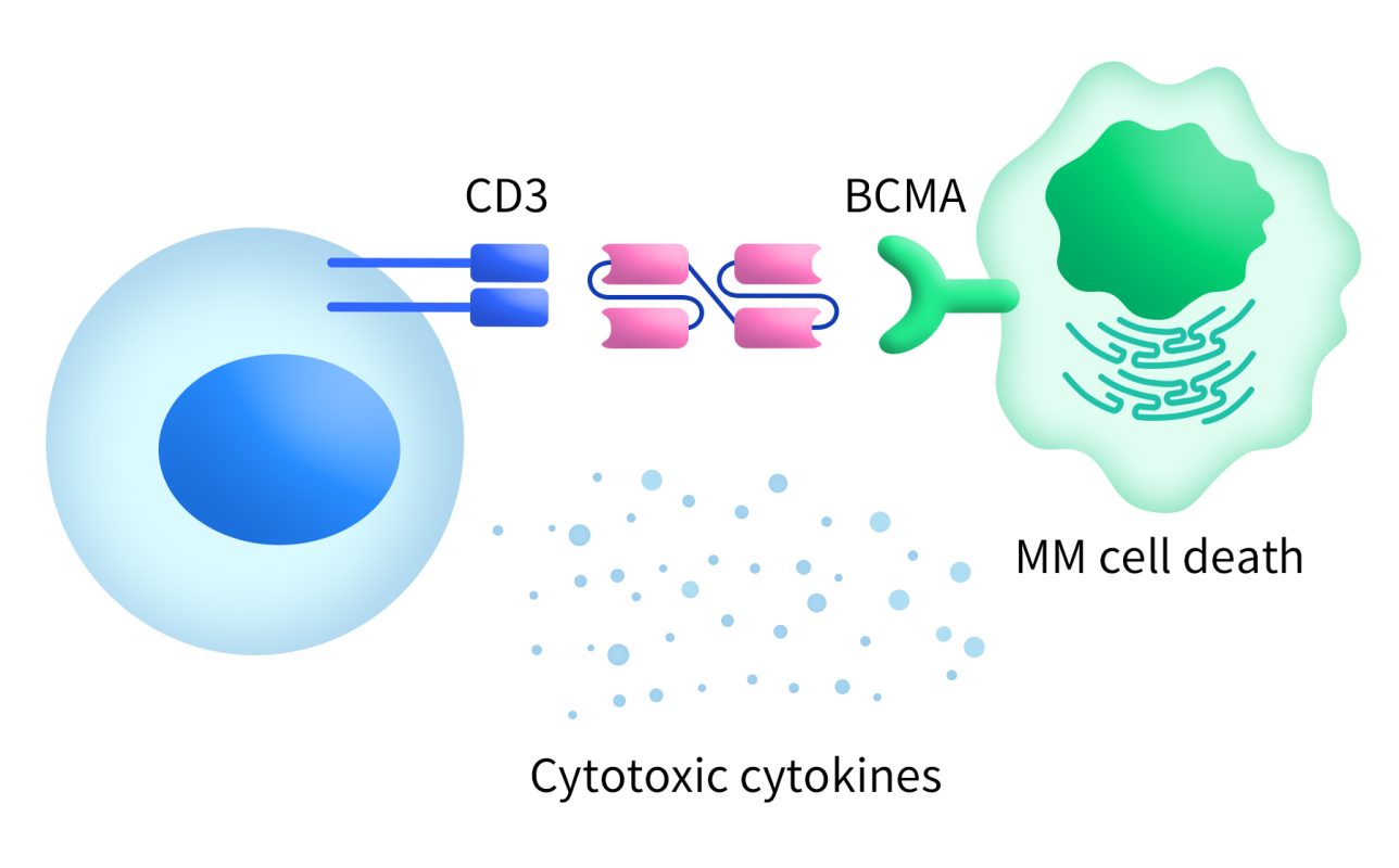 T 細(xì)胞結(jié)合器是經(jīng)過(guò)改造的抗體,用于重定向免疫系統(tǒng)的T細(xì)胞以便于識(shí)別并殺死癌細(xì)胞,它們旨在與癌細(xì)胞上表達(dá)的靶抗原和T細(xì)胞上的觸發(fā)分子(如 CD3)結(jié)合[3]。以雙特異性T細(xì)胞結(jié)合器(BiTE)為例,BiTE的一端與BCMA抗原結(jié)合,另一端與T細(xì)胞表面的CD3受體結(jié)合,從而將T細(xì)胞募集到MM細(xì)胞周圍,進(jìn)而殺傷MM細(xì)胞。