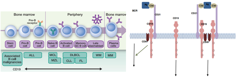 CD19為I型單次跨膜糖蛋白,在B細(xì)胞發(fā)育早期表達(dá),并在成熟B細(xì)胞階段持續(xù)表達(dá),是B細(xì)胞最可靠的表面生物標(biāo)志物之一。同時(shí)CD19與補(bǔ)體受體CD21,四跨膜蛋白CD81一起,是成熟B細(xì)胞表面上多分子復(fù)合物的主要信號(hào)傳導(dǎo)成分,在維持體液,抗原誘導(dǎo)的反應(yīng)和耐受誘導(dǎo)之間的平衡中起著關(guān)鍵作用。