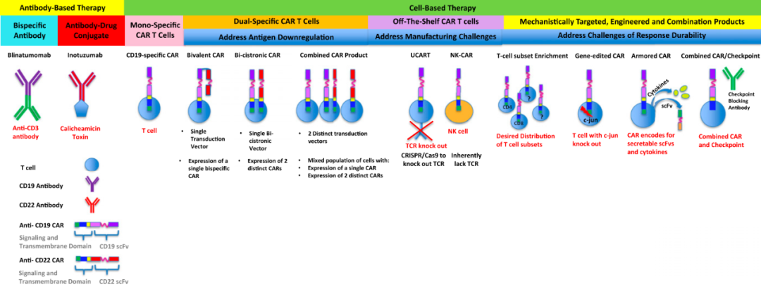針對(duì)B細(xì)胞相關(guān)血液腫瘤疾病,圍繞CD19靶點(diǎn)開(kāi)發(fā)了眾多類(lèi)型治療性藥物(單抗、雙抗、ADC、CAR-T),但主流還是扎堆在CAR-T療法上,總體是在降本增效上探索不同設(shè)計(jì)方案。