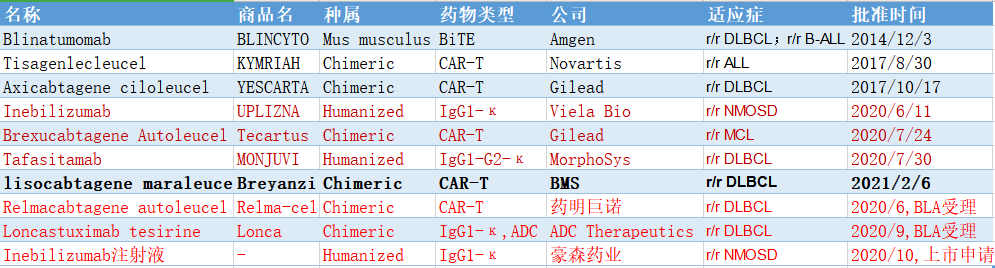 同時(shí)2020年也是靶向CD19生物藥獲批的收獲年:3款獲批(2款單抗,1款CAR-T),另有一款A(yù)DC、一款CAR-T藥物已提交BLA獲受理,同時(shí)豪森藥業(yè)引進(jìn)的Inebilizumab注射液(CD19單抗,Viela Bio)上市申請(qǐng)也獲受理。2021年2月5日,?FDA又批準(zhǔn)百時(shí)美施貴寶的Liso-cel上市(第四款獲批CAR-T細(xì)胞療法),這也是第四款靶向CD19靶點(diǎn)的CAR-T細(xì)胞療法。這么密集的獲批,也給了后來(lái)入局者非常大的壓力。??