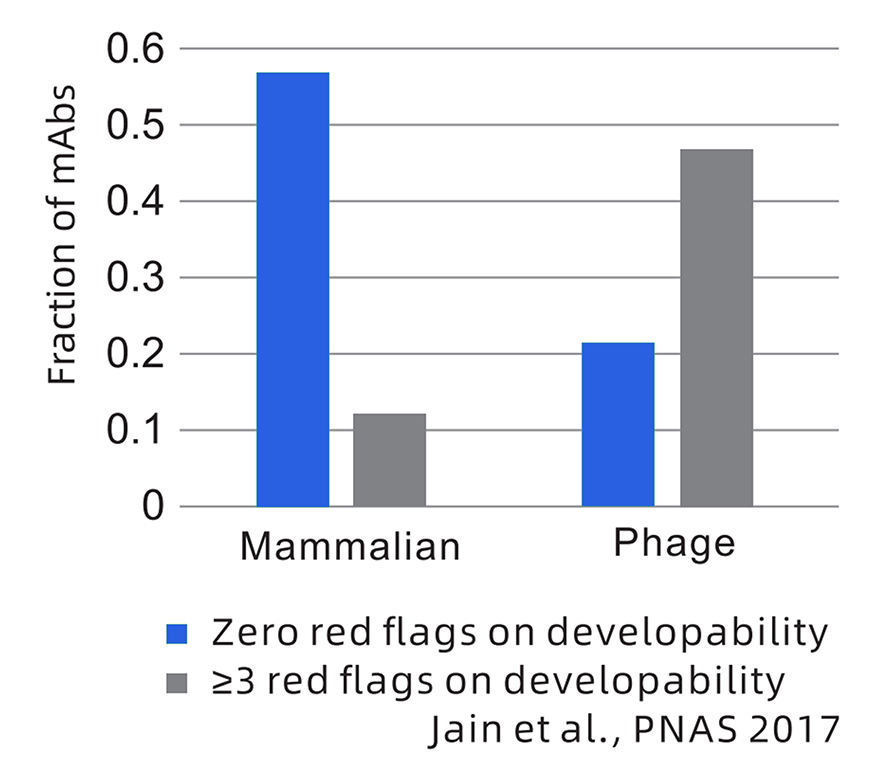 一個新開發(fā)的先導抗體分子最終能否成藥,會受到多種因素影響(包括:抗體可溶性,產(chǎn)量,構象穩(wěn)定性,免疫原性,非特異結合等)。Adimab的科學家對48種FDA已經(jīng)批準的和89種正在臨床2或3期的抗體藥,進行了12種常規(guī)成藥性指標測試。他們發(fā)現(xiàn)噬菌體平臺開發(fā)的抗體成藥可能性較低。(下圖是哺乳動物B細胞抗體篩選平臺對比噬菌體篩選平臺在成藥性上比較數(shù)據(jù))