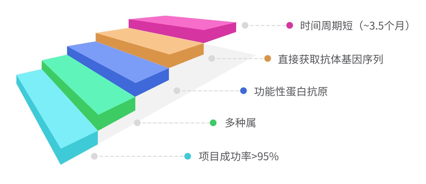 相對于其他抗體開發(fā)平臺,重組單克隆抗體開發(fā)平臺可以用于任何種屬的抗體開發(fā),所需時間遠低于常規(guī)的雜交瘤技術,開發(fā)出來的抗體成藥性高,陽性克隆數(shù)多,并可直接獲取抗體的序列,大量生產(chǎn)藥靶抗體供下游的人源化、親和力成熟、CAR-T功能驗證等臨床前實驗。