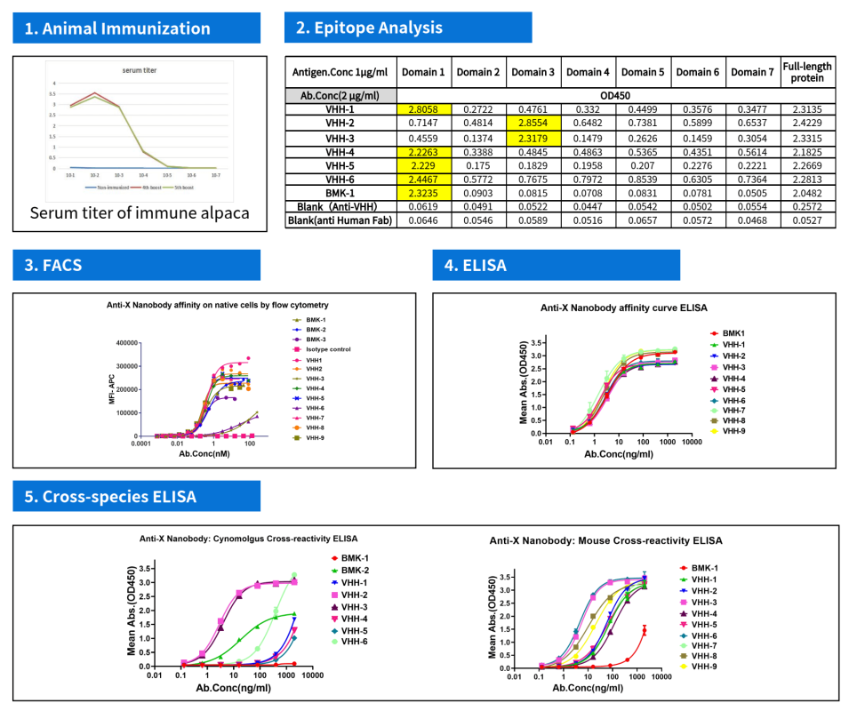 | IV | 抗體篩選 | 3-5周 | ELISA分析報告&ELISA陽性納米抗體序列 |