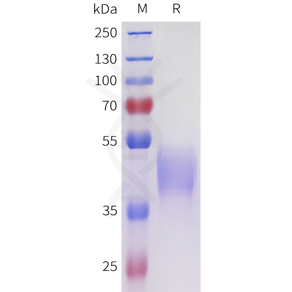 | Molecular Weight | The protein has a predicted molecular mass of 34.3 kDa after removal of the signal peptide. The apparent molecular mass of ACVR2A(38-106)-mFc is approximately 35-55 kDa due to glycosylation. |